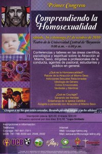 Según su descripción, Courage es un «apostolado de la Iglesia Católica que provee atención pastoral a hombres y mujeres con atracción no deseada hacia su mismo sexo». Según mi descripción, ésta es una hipocresía más y una charlatanería más del fundamentalismo católico que se esconde detrás de «actos compasivos» para seguir fomentando el odio y la intolerancia.