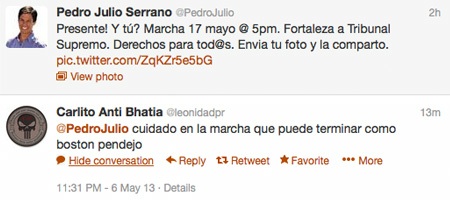 El juez Fusté le preguntó al hoy convicto si era cierto que el 6 de mayo pasado, usando el seudónimo Carlito anti Bhatia@leonidapr, escribió en la cuenta de Twitter de Serrano: «Cuidado en la marcha que puede terminar como en Boston pende…», a lo que Morales Serrano contestó que sí.