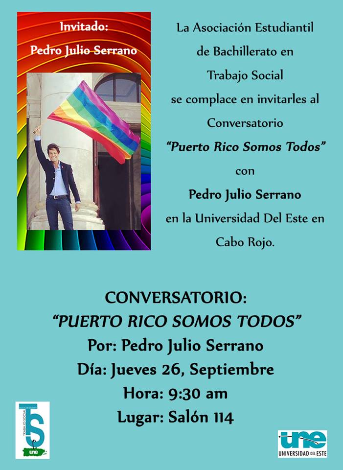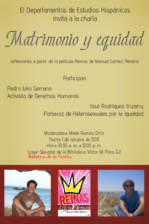 Además, el martes 1 de octubre estaré en la Universidad de Puerto Rico, recinto de Cayey. La charla «Matrimonio y equidad» contará también con la participación del presidente de Heterosexuales por la Igualdad, José Rodríguez Irizarry.