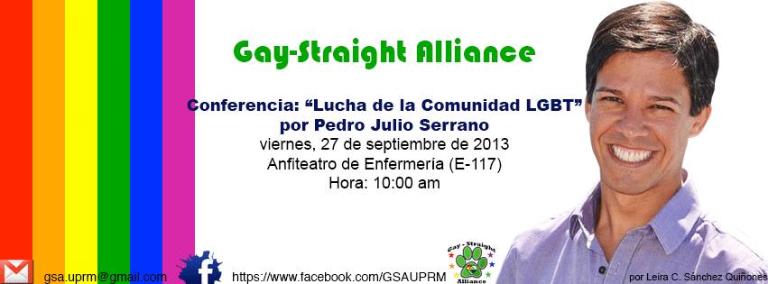 Luego, el viernes 27, tendremos una charla, auspiciada por la Gay-Straight Alliance del Recinto universitario de Mayagüez de la Universidad de Puerto Rico. La conferencia «La lucha de la comunidad LGBTT» se llevará a cabo a las 10am en el Anfiteatro de Enfermería (E-117).