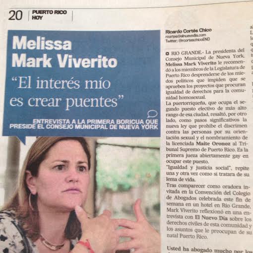 Tras comparecer como oradora invitada en la Convención del Colegio de Abogados celebrada este fin de semana en un hotel de Río Grande, Mark Viverito reflexionó en una entrevista con El Nuevo Día sobre los derechos civiles de esta comunidad y los asuntos que le preocupan de su natal Puerto Rico.