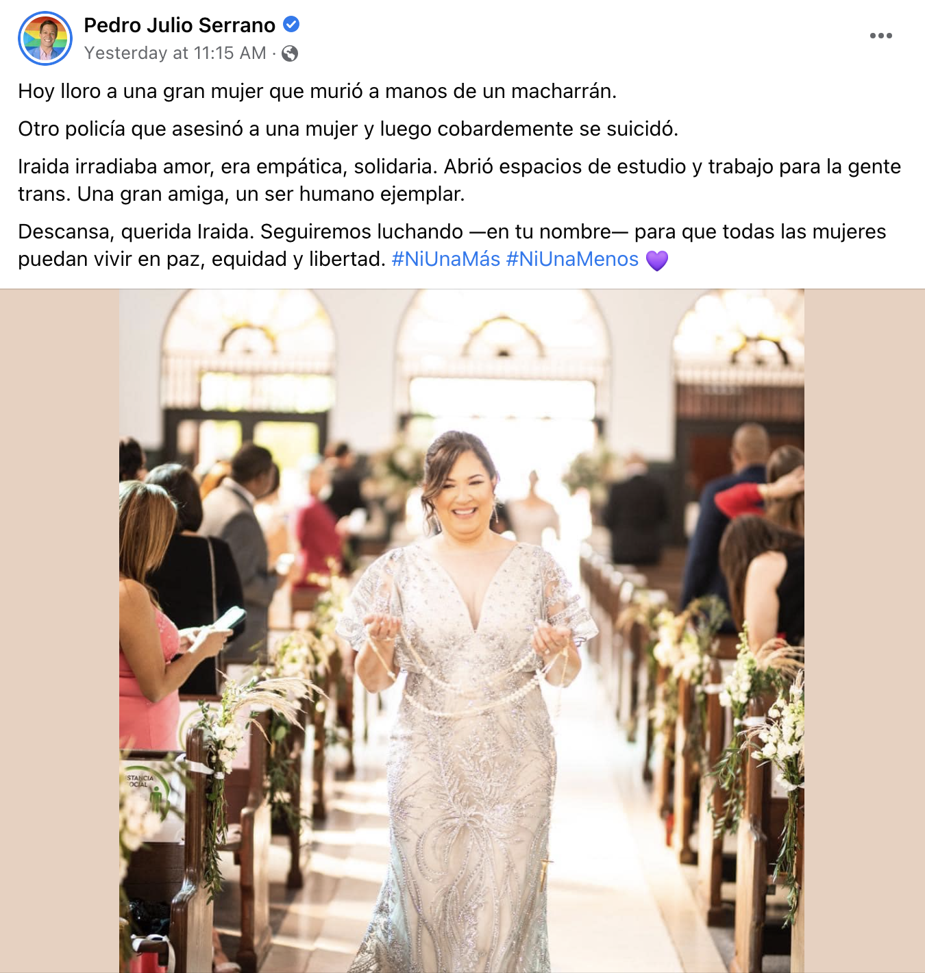 “Hoy lloro a una gran mujer que murió a manos de un macharrán. Otro policía que asesinó a una mujer y luego cobardemente se suicidó. Iraida irradiaba amor, era empática, solidaria (…) Descansa, querida Iraida. Seguiremos luchando —en tu nombre— para que todas las mujeres puedan vivir en paz, equidad y libertad. #NiUnaMás #NiUnaMenos”, escribió Serrano en Facebook.