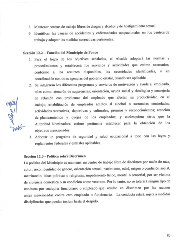 El portavoz de Puerto Rico Para Todes destacó que la Ordenanza Municipal #25 de la serie 2018-2019 es la que establece el Reglamento de Personal del Municipio Autónomo de Ponce y contiene, en la página 83, una política de no discrimen que incluye la orientación sexual e identidad de género.