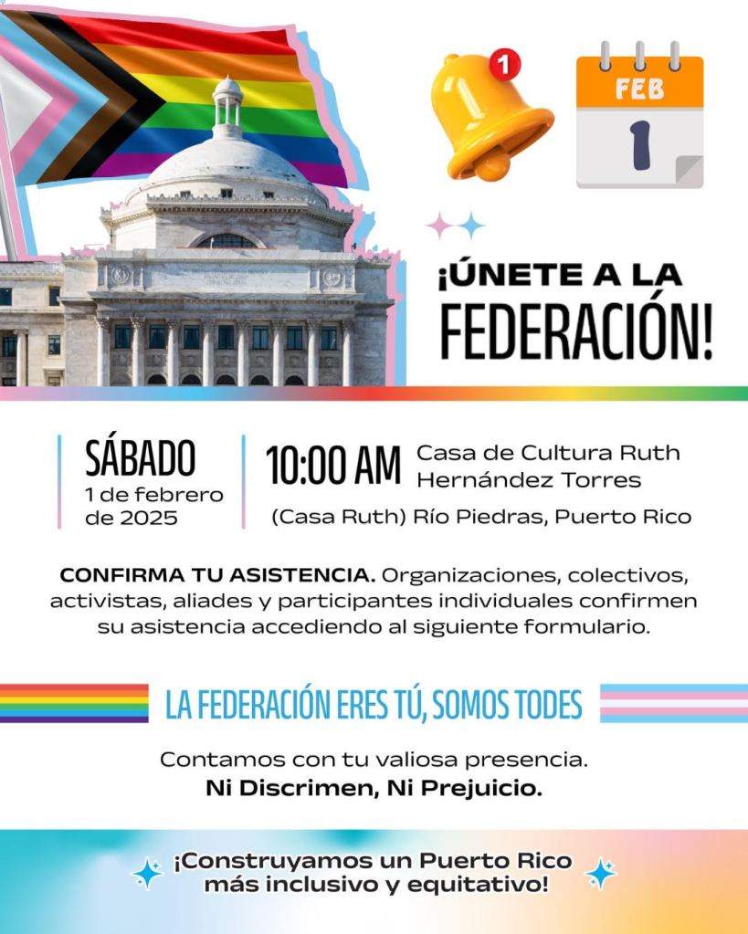 Como parte de los preparativos, la Federación invita a la comunidad LGBTQ+ y aliados a participar de su primera asamblea anual a llevarse a cabo el sábado 1 de febrero a las 10am en Casa Ruth en Río Piedras. Las personas interesadas en participar pueden registrarse aquí: bit.ly/3Eec1hZ.