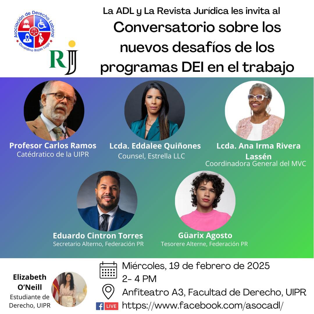 La Asociación de Derecho Laboral, Osvaldino Rojas Lugo (ADL), y La Revista Jurídica (RJ) de la Facultad de Derecho de la Universidad Interamericana de Puerto Rico presentarán el “Conversatorio sobre los nuevos desafíos de los programas DEI en el trabajo” el miércoles, 19 de febrero de 2025 a a las 2 PM hasta las 4 PM en el anfiteatro A3 de la Facultad de Derecho en Hato Rey.
