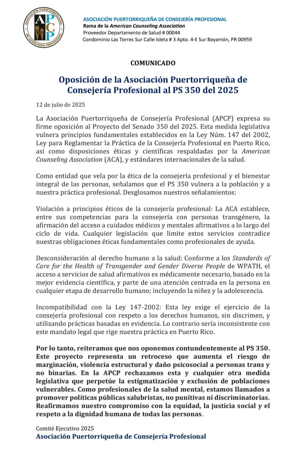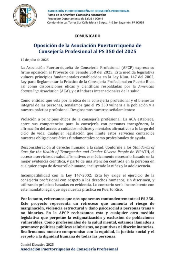 La Asociación Puertorriqueña de Consejería Profesional (APCP) pidió que no se convierta en ley el Proyecto del Senado 350 por criminalizar a los profesionales de la salud mental por brindar terapias con el consentimiento de padres y madres de personas trans menores de 21 años.